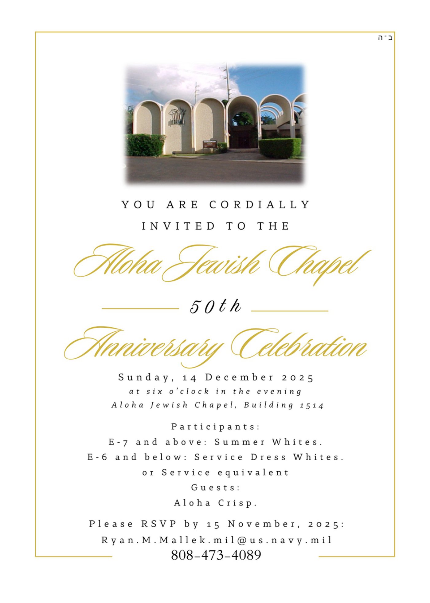 Shabbat Service Every Friday from 1930-2130 at the Aloha Jewish Chapel